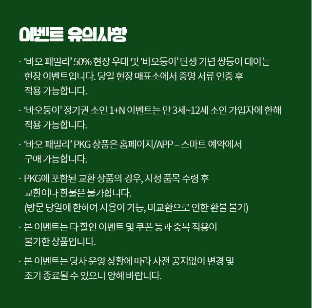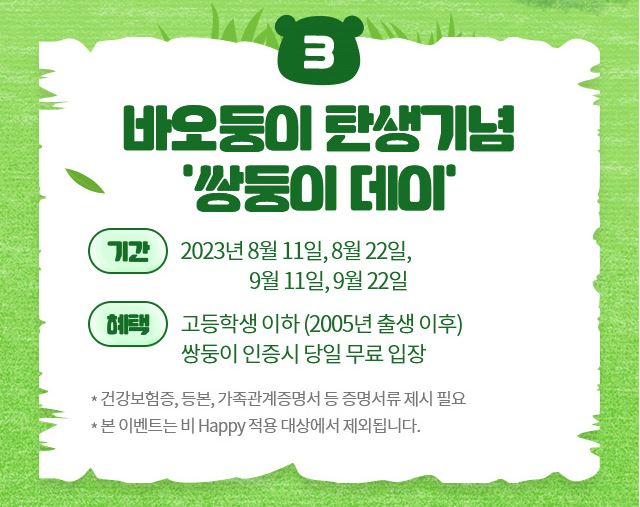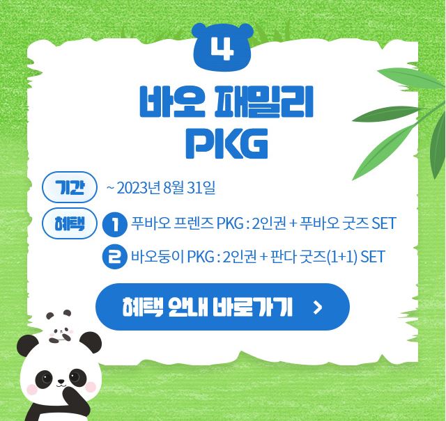 아울러 에버랜드는 맏언니인 푸바오와 쌍둥이 동생 등 판다 세 자매와 같이 3자녀 이상 가족들에게도 특별한 혜택을 제공합니다. 특히, 8월말까지 에버랜드 이용권을 50% 할인해주는 바오 패밀리 우대 행사를 진행하고 있습니다. 이 이벤트는 3자녀 중 한 명 이상이 만 15세 이하일 경우 적용 가능하며, 부모님과 3자녀 등 가족이 함께 방문하거나 각각 방문해도 모두 혜택을 받을 수 있습니다.