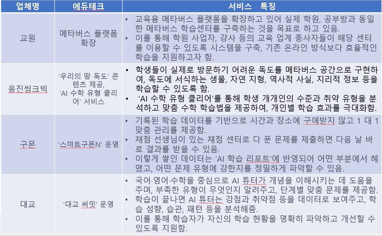 - 'AI 수학 유형 클리어', '매쓰피드(Mathpid)', '검정교과서 학습관', 'AI 그래머 트레이닝', '스마트올 메타버스' 등의 다양한 학습 서비스를 제공하고 있음.
