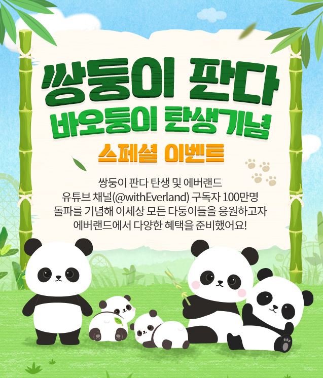 에버랜드는 지난 7월 7일에 태어난 국내 첫 쌍둥이 판다 탄생을 기념하여 8월 11일과 22일, 9월 11일과 22일 등 나흘간 고등학생 이하 쌍둥이 고객들에게 당일 에버랜드 무료 입장 혜택을 제공한다고 22일 밝혔습니다. 이는 에버랜드에서 새로운 판다 두 마리의 탄생을 축하하고, 쌍둥이 고객들을 위한 특별한 이벤트로 마련한 것입니다. 앞서 7월 7일에 탄생한 쌍둥이 판다는 젊은 엄마 푸바오의 자연번식에 의해 태어나, 국내 외에도 많은 전문가들과 동물애호가들의 주목을 받았습니다.